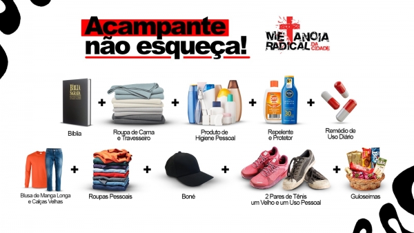 Bíblia, roupa de cama, travesseiro, cobertor, toalha de banho, material de higiene e uso pessoal, chinelo, remédio de uso diário (se necessário), repelente, protetor solar. Além das roupas de uso cotidiano, levar um par de tênis velho, blusa de manga comprida e uma calça velha.
